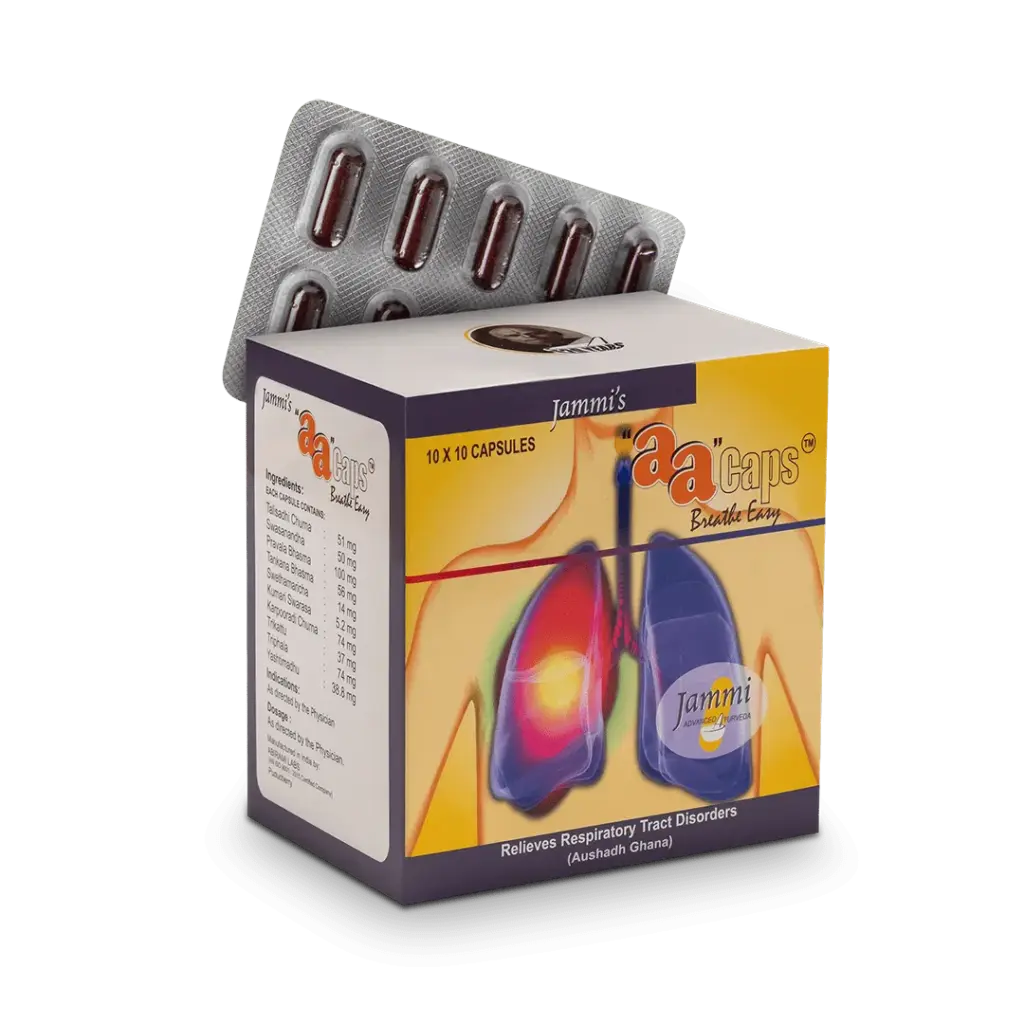 AA caps is a proprietary Ayurvedic formulation from Jammi’s which contains classical ingredients which are well known to address the various aspects of Respiratory Distress including breathing difficulties, asthma and wheezing. In fact the main ingredient of AA caps is Swasananda Rasa which is a classical formulation KNOWN to help with breathing difficulties. As the name indicates (Swasa – in sanskrit Swasa is the term for “forced breathing as is the case in bronchial asthma” and other types of breathing issues & Ananda – happiness), it allows for easy and comfortable respiration. Other ingredients in AA caps include Talisadi Churna, Tankana Bhasma, Pravala Bhasma, Triphala Churna, Trikattu Churna and Karpooradi Churna.